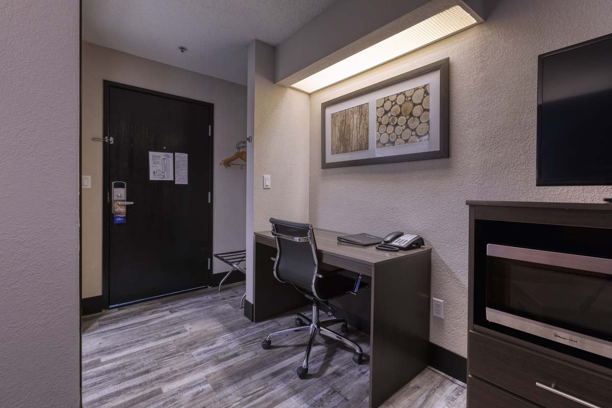 Enjoy the convenience of complimentary Wi-Fi and a satisfying breakfast to start your day. This suite is equipped with a mini-refrigerator and microwave for quick snacks, along with an in-room coffee/tea maker. Additional amenities include a hair dryer, HDTV, bathroom essentials, an alarm clock, desk, iron, ironing board, and a laptop-safe, complemented by cozy tables and chairs for relaxation or work.